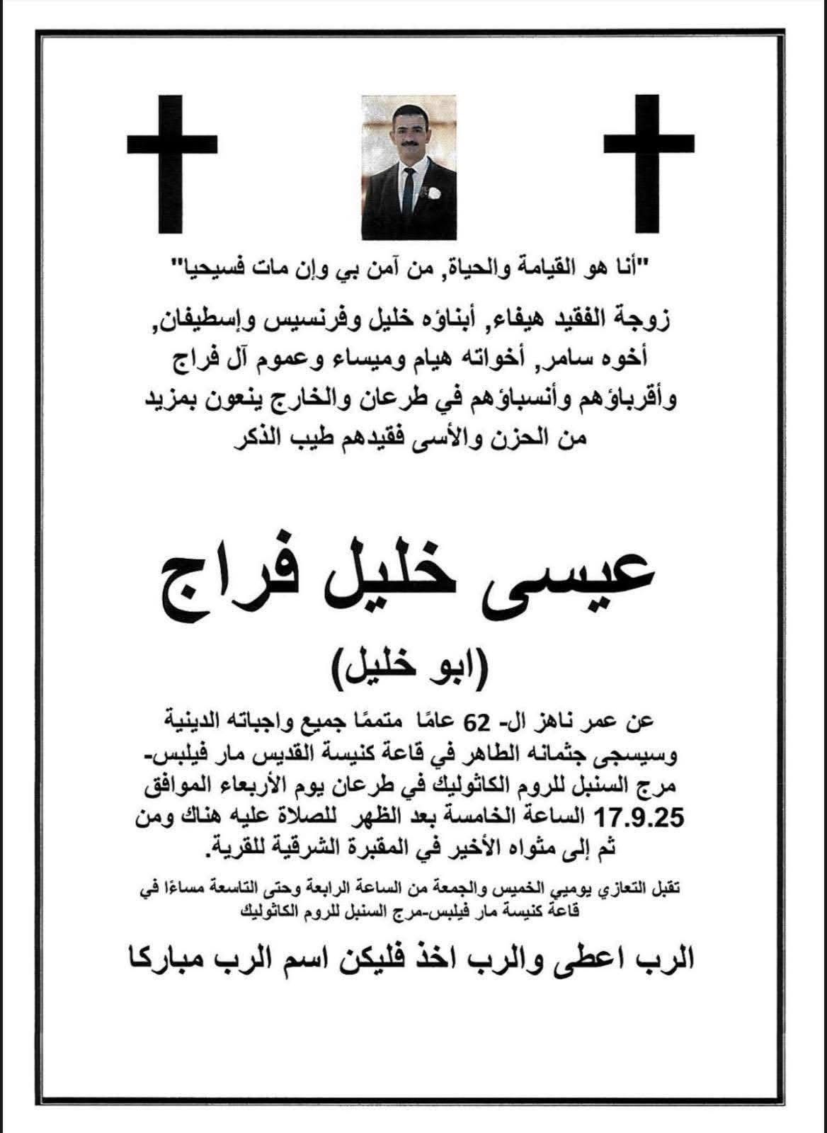 انتقل الى رحمة الله تعالى عيسى خليل فراج ( ابو خليل ) عن عمر ناهز الـ 62 عاما . وسيسجى جثمانه الطاهر في قاعة كنيسة القديس مار فيلبس - مرج السنبل للروم الكاثوليك في طرعان يوم غد الاربعاء الساعة الخامسة