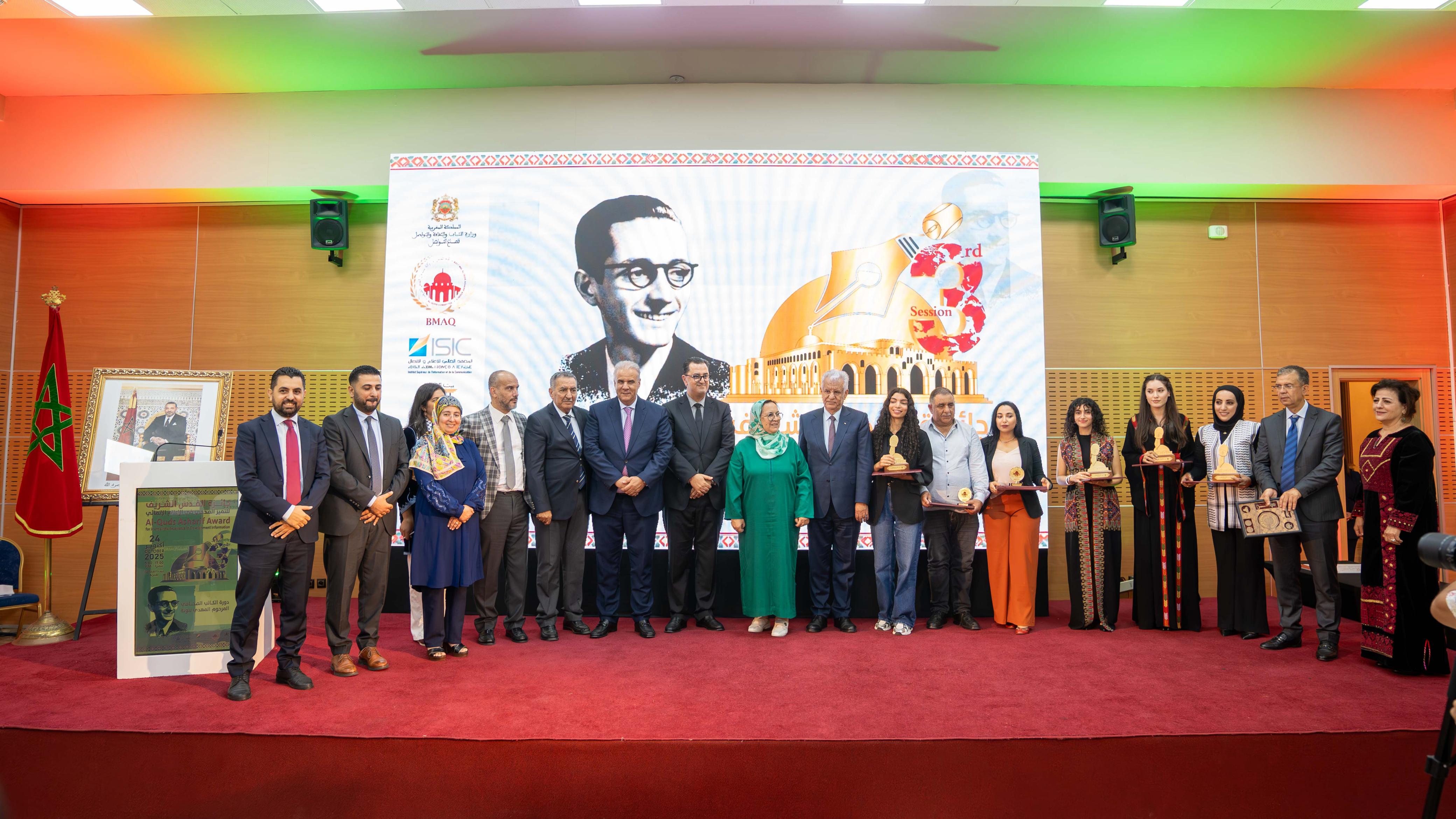جرى مساء أمس الجمعة بطنجة (شمال المغرب) تتويج الفائزين في الدورة الثالثة لجوائز القدس الشريف للتميز الصحفي في الإعلام الإنمائي، الموجهة سنويا لطلاب مدارس ومعاهد وكليات الصحافة في المغرب وفلسطين،