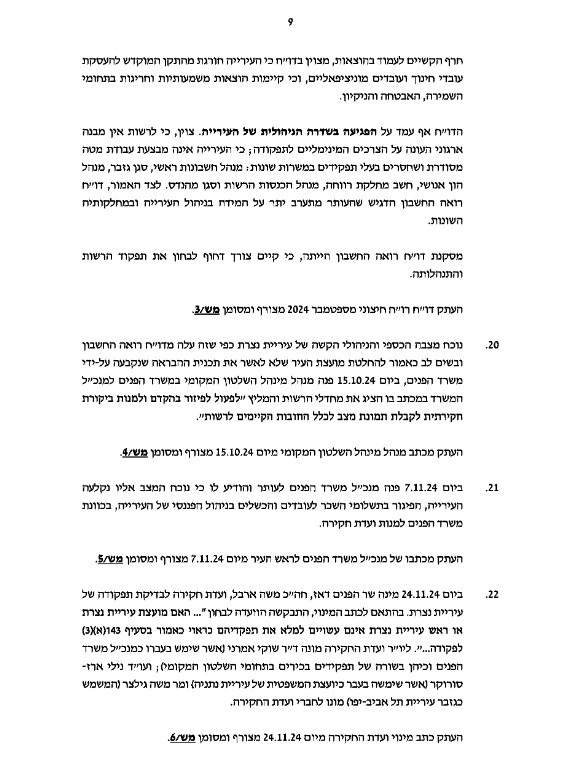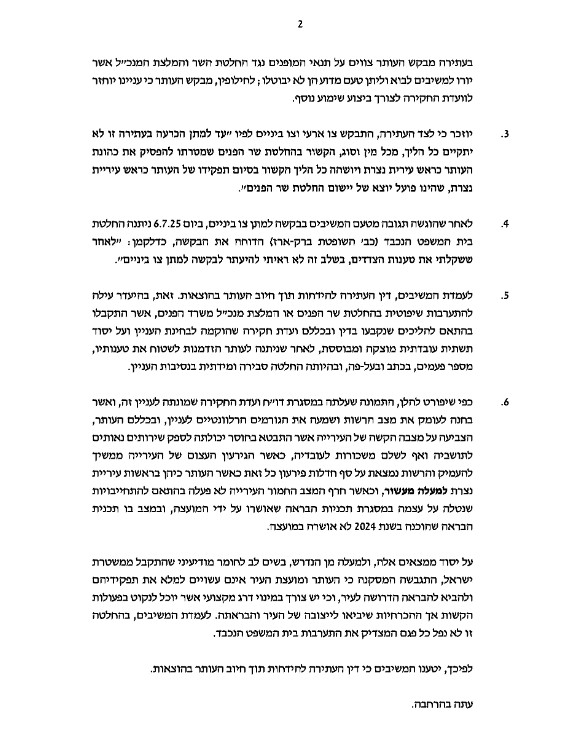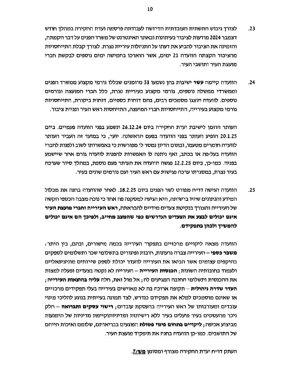 وجاء في الرد المطوّل المقدم من قبل وزارة الداخلية والذي حصل موقع بانيت على نسخة عنه " ان قرار الوزير موشيه أربيل كان بناء على توصية قدمها مدير عام الوزارة، رونين بيرتس، الذي وجد اعتمادا على فحص لجنة تحقيق وفحوى تقريرها أن رئيس البلدية والمجلس البلدي لا يمكنهم أداء وظيفتهم، وان البلدية بحاجة لإجراءات للاستقرار والتعافي من الوضع الخطير الذي وصلت اليه، لذا هنالك حاجة لاستبدال ممثلي الجمهور المنتخبين بآخرين مهنيين".