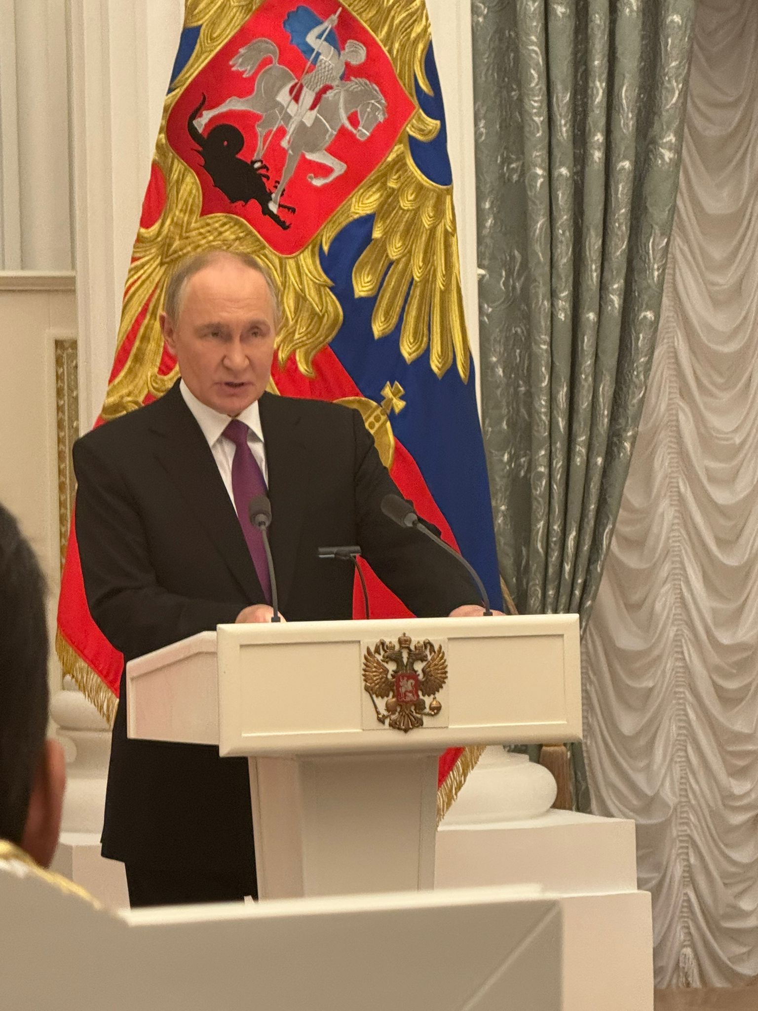 واختتم قائلا: "أؤكد أنني سأواصل، بكل ما أستطيع، العمل من أجل تعزيز العلاقات الدولية والثقافية والإنسانية والاقتصادية مع روسيا الاتحادية، لما فيه الخير لشعوبنا. مرة أخرى، أتقدّم بخالص الشكر والتقدير على هذا الشرف الكبير. شكرًا جزيلًا لكم" .