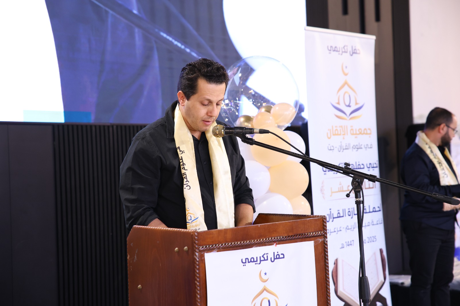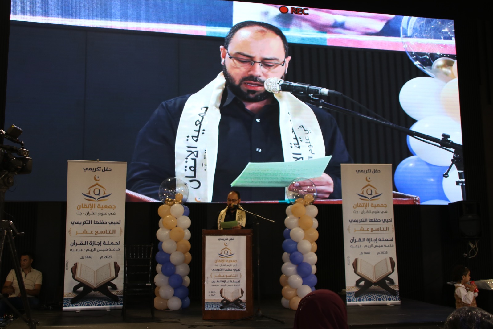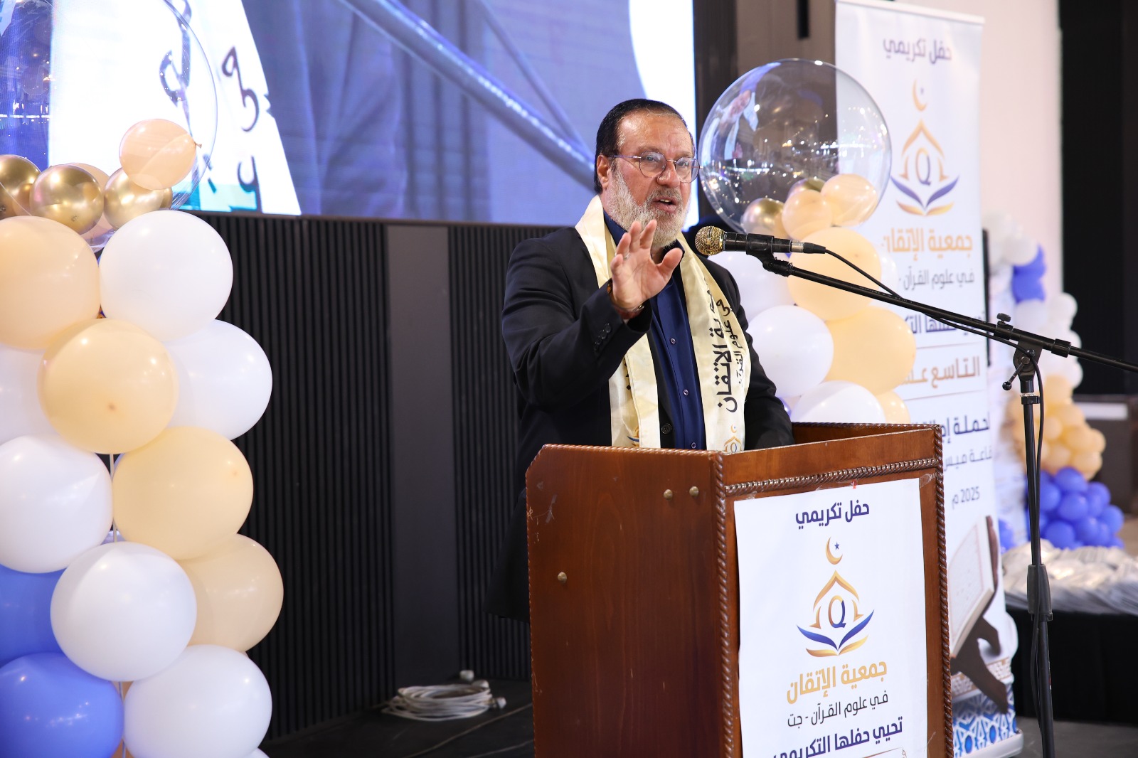 ثمّ صدح صوت الداعية الكبير الدكتور إياد عامر ضيف الحفل بكلمةٍ ملؤها الإيمان، أشاد فيها بجمعية الإتقان وجهودها، وأكد أن هذا الحفل ليس ختامًا لمسيرة، بل بداية لطريقٍ منيرٍ في صحبة كلام الله، داعيًا المجازين إلى أن يكونوا قدوةً في الأخلاق وحُرّاسًا للقيم في زمنٍ يبهت فيه الصدق والنور.