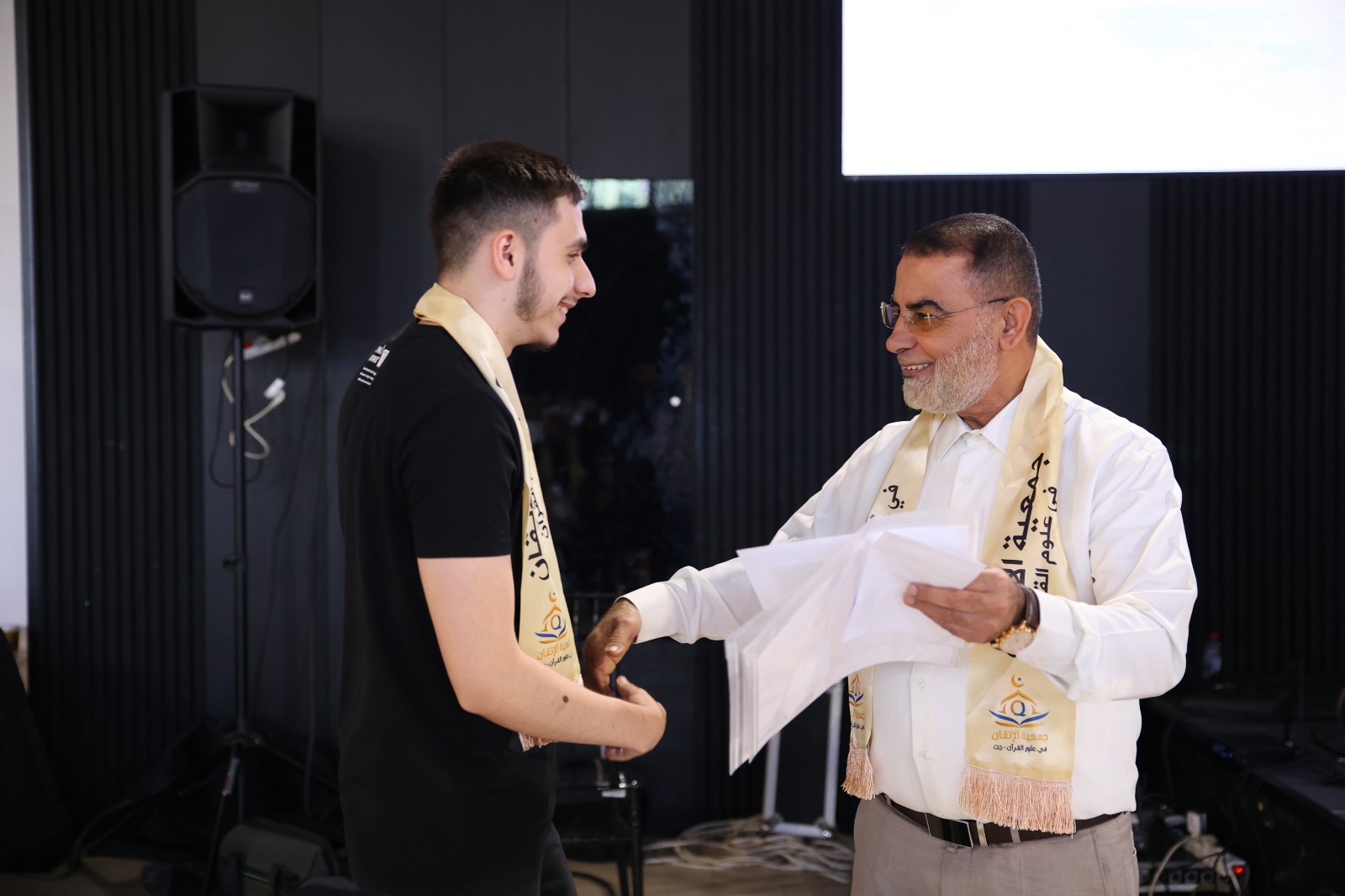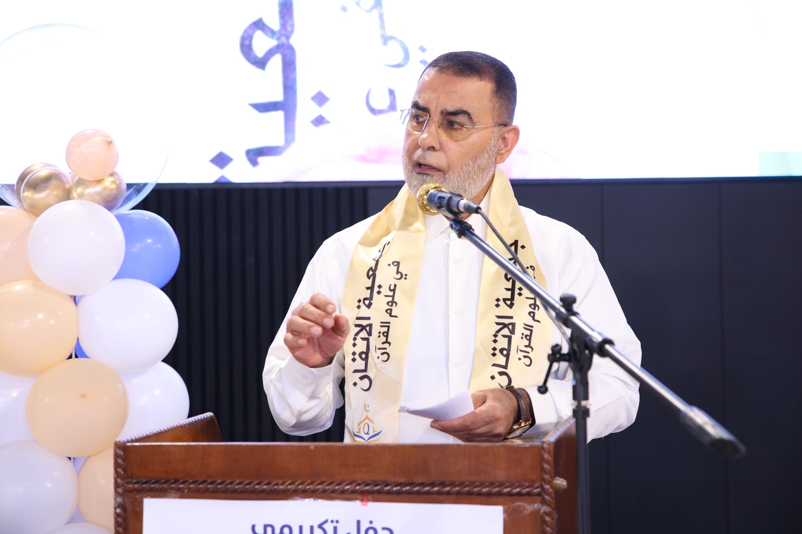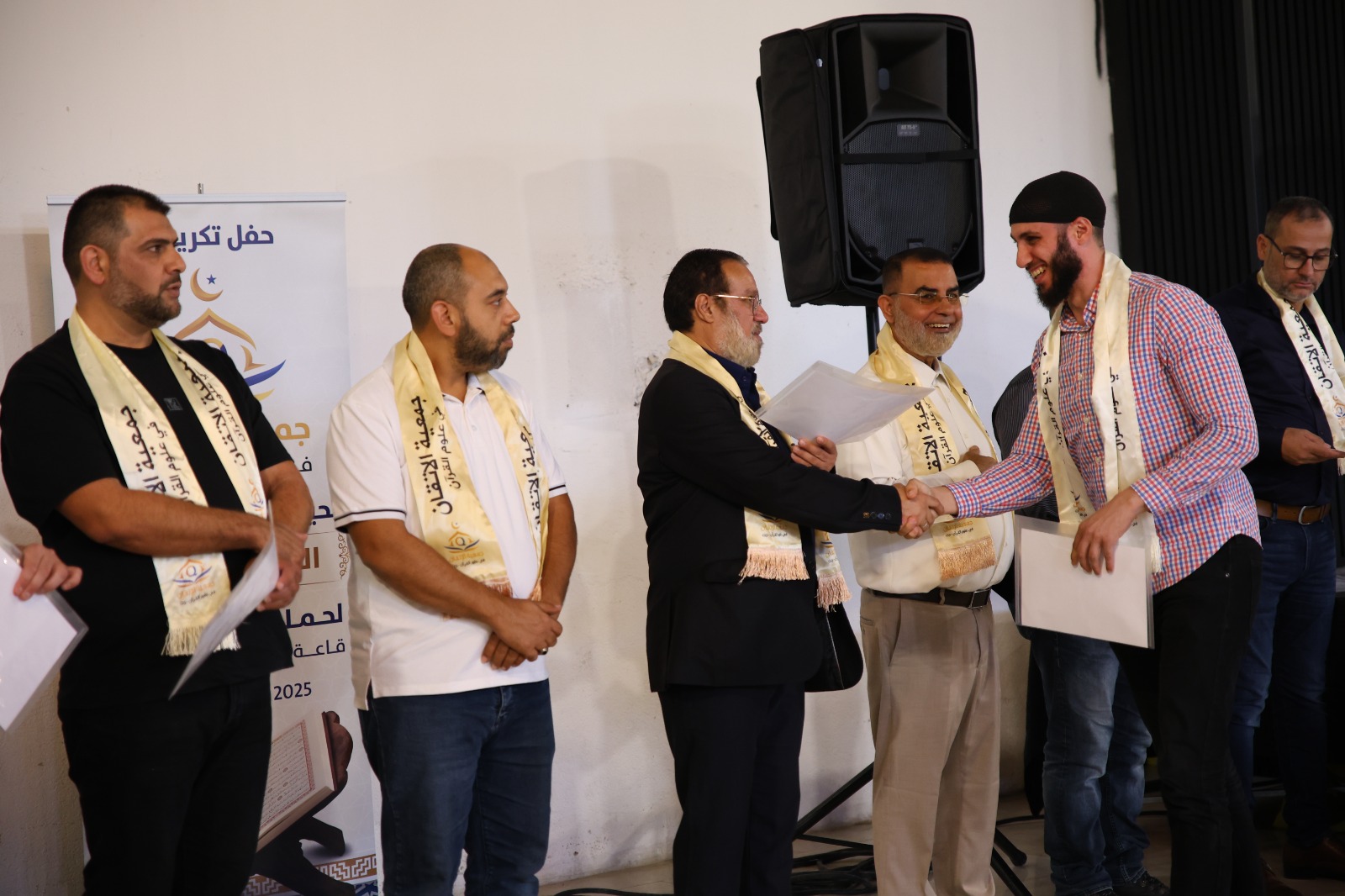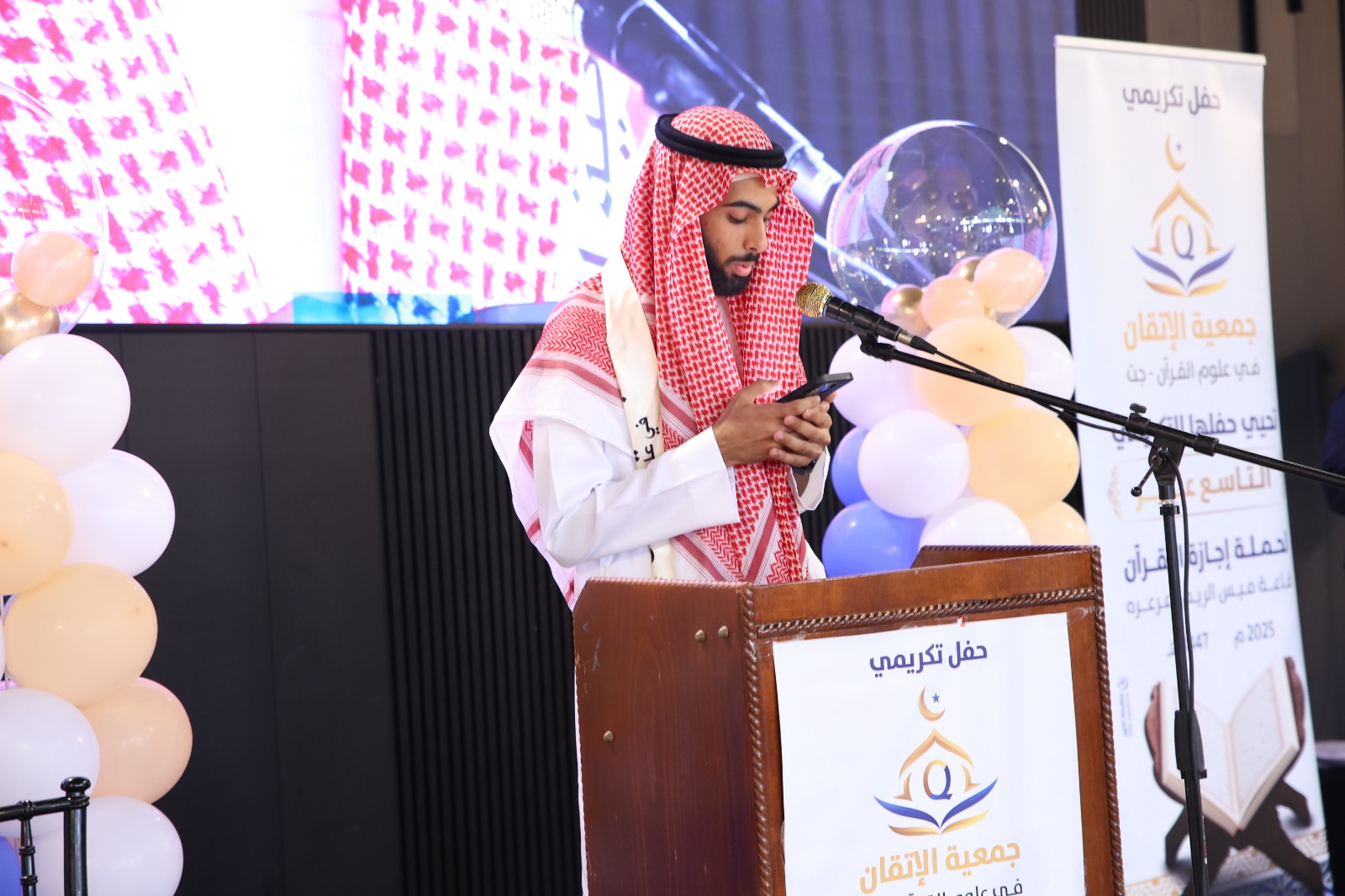 ثمّ صدح صوت الداعية الكبير الدكتور إياد عامر ضيف الحفل بكلمةٍ ملؤها الإيمان، أشاد فيها بجمعية الإتقان وجهودها، وأكد أن هذا الحفل ليس ختامًا لمسيرة، بل بداية لطريقٍ منيرٍ في صحبة كلام الله، داعيًا المجازين إلى أن يكونوا قدوةً في الأخلاق وحُرّاسًا للقيم في زمنٍ يبهت فيه الصدق والنور.