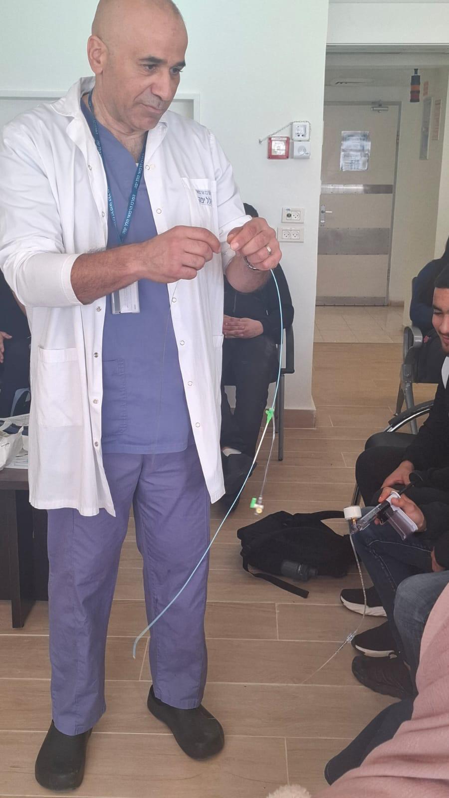 قدّم البروفيسور رامي أبو فنه للطلاب شرحًا مهنيًا حول عملية القسطرة والأدوات المستخدمة فيها، إلى جانب عرض عملي وجولة داخل قسم العناية المكثفة وغرفة العمليات للاطلاع على الأجهزة المتقدمة وآليات العمل الجراحي.