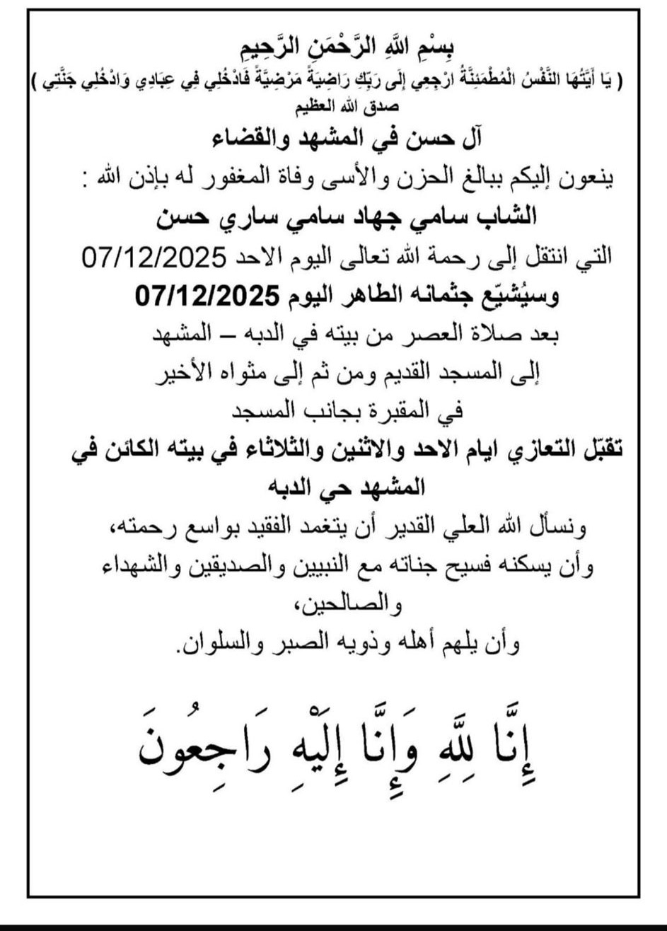 انتقل الى رحمته تعالى الشاب سامي جهاد سامي ساري حسن من المشهد .