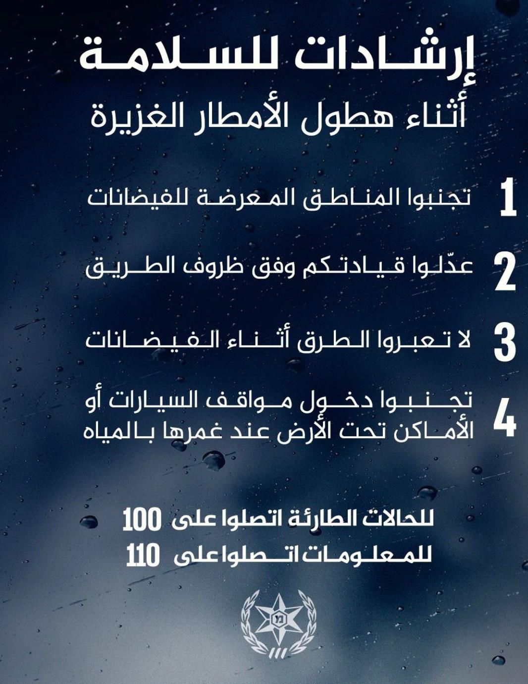 ستقوم الشرطة بنشر أي معلومات تتعلق بإغلاقات طرق أو اضطرابات مرورية بسبب الأحوال الجوية، وتوصي الجمهور بالامتناع عن الوصول إلى مناطق قد تشهد أخطارًا مناخية، ومتابعة نشرات الطقس باستمرار" .